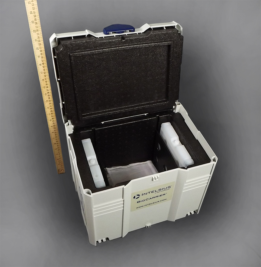 The BioCarrier 4 (2-8) is a rigid, durable, reusable transit case designed for local courier routes and multiple site sample collections. The rugged polymer outer with the EPP insulated liner maintains sample integrity at 2-8°C for up to 12 hours.